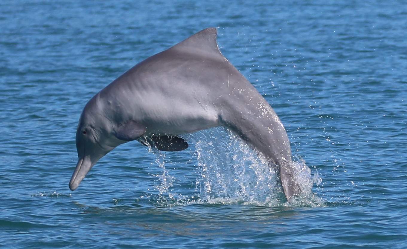 The Indo-Pacific bottlenose dolphin is similar in appearance to the closely-related common bottlenose dolphin but generally smaller, with a relatively long snout & spots on its sides. It is dark grey, with paler undersides.